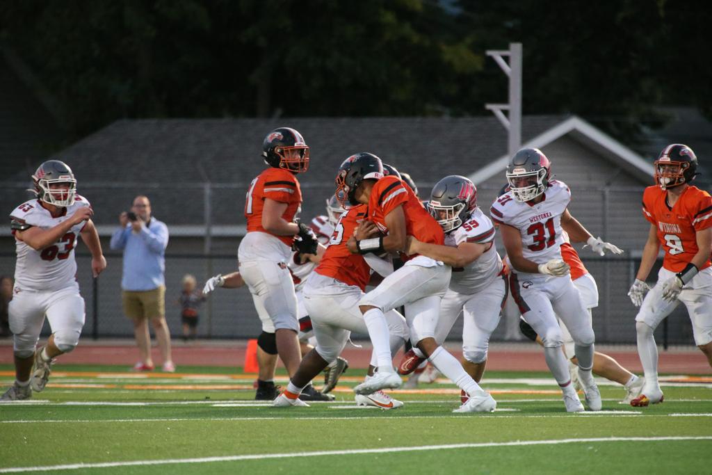 Winona (0-2) also opted to go for it on a 4th and short from the Westonka 39-yard line on their first possession, but Mound Westonka stopped Winona running back Ronnie Lemon on a sweep to the left. Safety Owen McCue made the initial hit coming up from his safety position as a host of White Hawks finished it off. However, Westonka couldn’t take advantage of the good field position. Drill’s pass was tipped by junior wide receiver May Kraay on a fade route down the left sideline and then intercepted by the Winhawks at the 2-yard line. After both teams exchanged punts on their next possessions, the White Hawk defense stood firm again and forced a 4th and long, but a roughing the kicker penalty on a bad snap gave Winona new life. The Winhawks drove to the Westonka 4-yard line but had to settle for a 21-yard field goal.