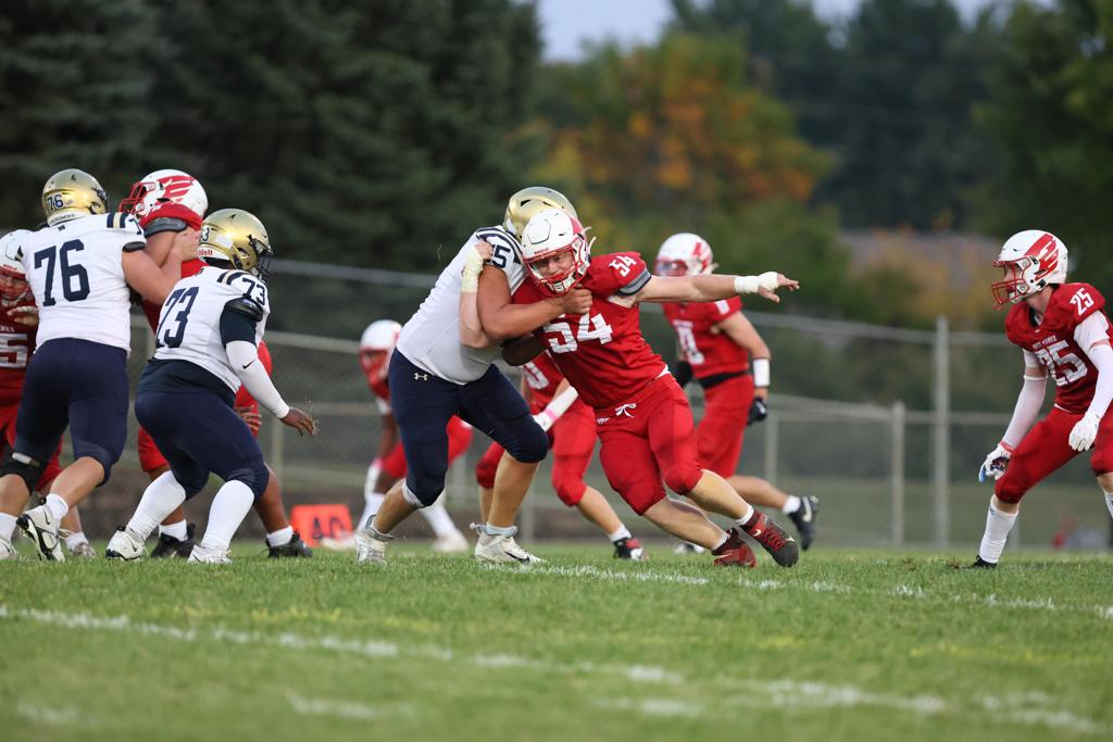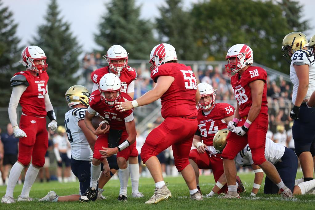 Minnetrista, MN – The Westonka defense shut out the visiting Lions in the second half enroute to a 16-10 victory over Providence Academy on Friday night, securing their first win of the season. Senior QB Cade Newell led the White Hawks offense throwing for 110 yards and rushing for another 131 yards and a touchdown. Senior safety Brandt Tebbs and linebackers Andrew Hoisington and Anders Mjelstad led the Red and White on the defensive side of the ball holding the Lions to just 69 yards their last five meaningful possessions. “The defense came up big during big moments all night long. The defense played on a short field most of the game but just continued to go to work and got the job done all night long,” said an emphatic Nick David, the head coach of the White Hawks.